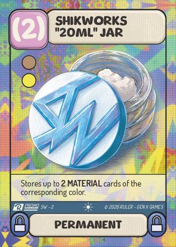 Bote "20ml" Shikworks (Shikworks "20ml" Jar) is a promotional Permanent card for the urban card game Ruler. Unlike disposable items, this card remains in the player's play area, providing a persistent strategic advantage throughout the game. This promo allows players to store up to 2 Material cards of the corresponding colors (Brown and Yellow). This...