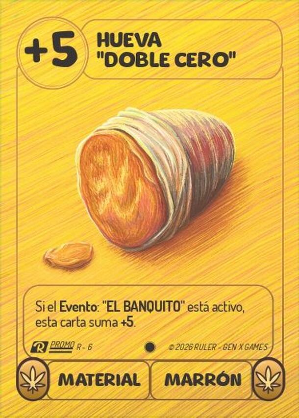 Hueva "Doble Cero" is a promotional Material card for the urban card game Ruler. This Brown Material card provides a base value of +5 prestige points. However, it features a powerful synergy: if the "EL BANQUITO" event is currently active, the card's value increases by an additional +5, for a total of +10 points. This promo is a Generación X exclusivity...