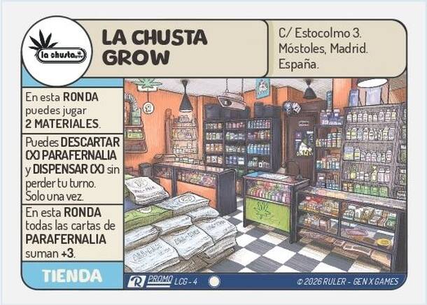 La Chusta Grow is a promotional "Tienda" (Shop) card for the urban card game Ruler. This promo card represents a real-world location in Móstoles, Madrid. During the round it is active, players can play up to 2 Materials and all Paraphernalia cards receive a +3 score bonus. Additionally, it offers a powerful one-time ability: you can discard (X)...