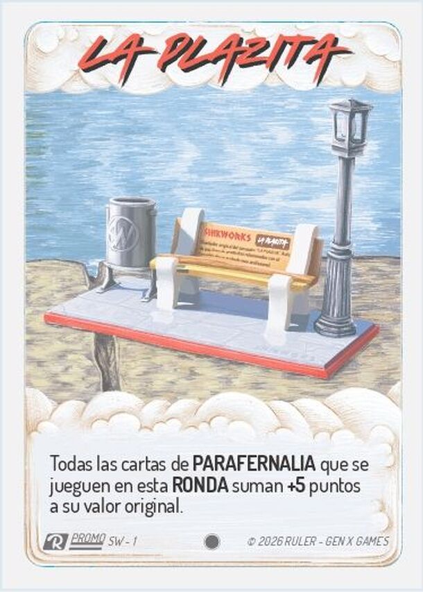 La Placita is a promotional card for the board game Ruler, available as a ShikWorks exclusive. This promo introduces a temporary global effect during a round. When active, it boosts the scoring potential of Paraphernalia cards, encouraging players to time their sets for maximum impact. Card Effect: "All PARAPHERNALIA cards played during this ROUND add +5...
