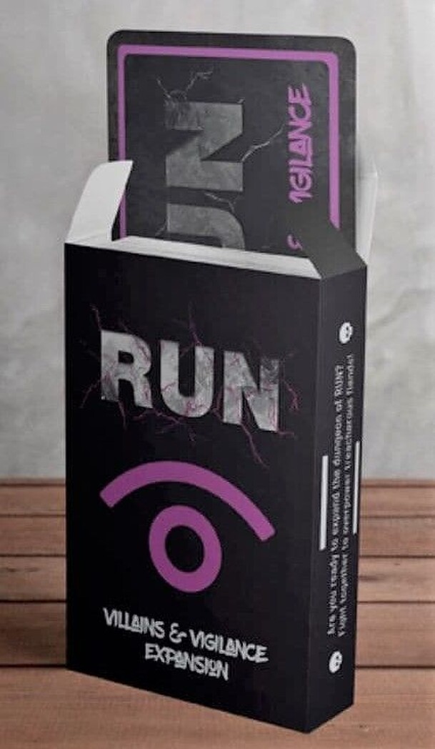 A RUN: Villains & Vigilance egy nagyon könnyen tanulható kiegészítő a RUN társasjátékhoz, 1 - 8 játékos részére, az átlagos játékidő rövidebb, csak 15 - 45 perc. A társast, a könnyebb tanulhatósága miatt, akár már 6 éves kortól ajánljuk kipróbálni. Kooperatív jellegű, a játékmenet erősen épít a kockadobás és a card play conflict resolution mechanizmusokra.