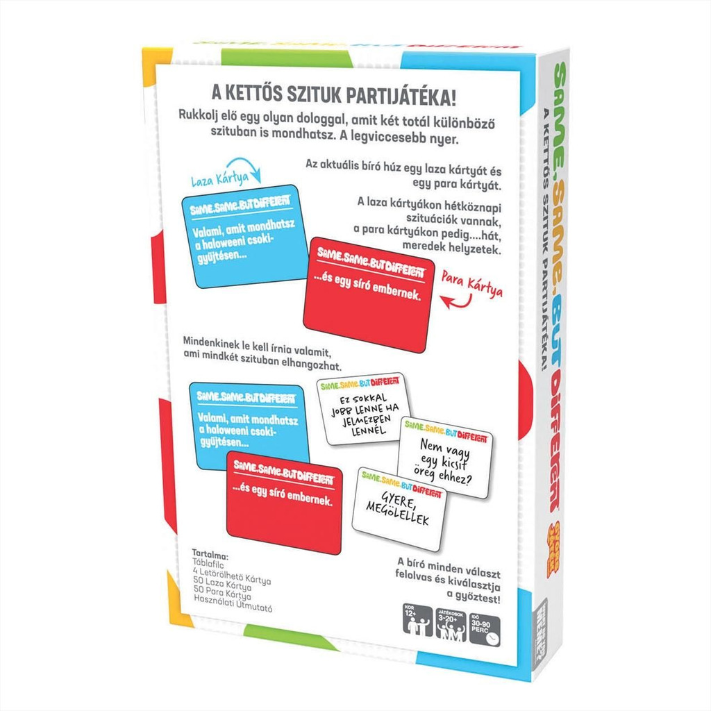 Megvan az a szitu, amikor kimondasz egy mondatot, és ráeszmélsz, hogy amit mondtál más helyzetben valami egészen mást jelentett volna? Na, akkor hozzunk össze pár ilyet a Same Same but Different parti társasban! A pakli 50 laza és 50 para kártyát tartalmaz. Mindkettőből húznotok kell, utána pedig lássuk, milyen mondatot mondanátok, ami mindkét helyzetben megállja a helyét. Ki teszi magasabbra a lécet?