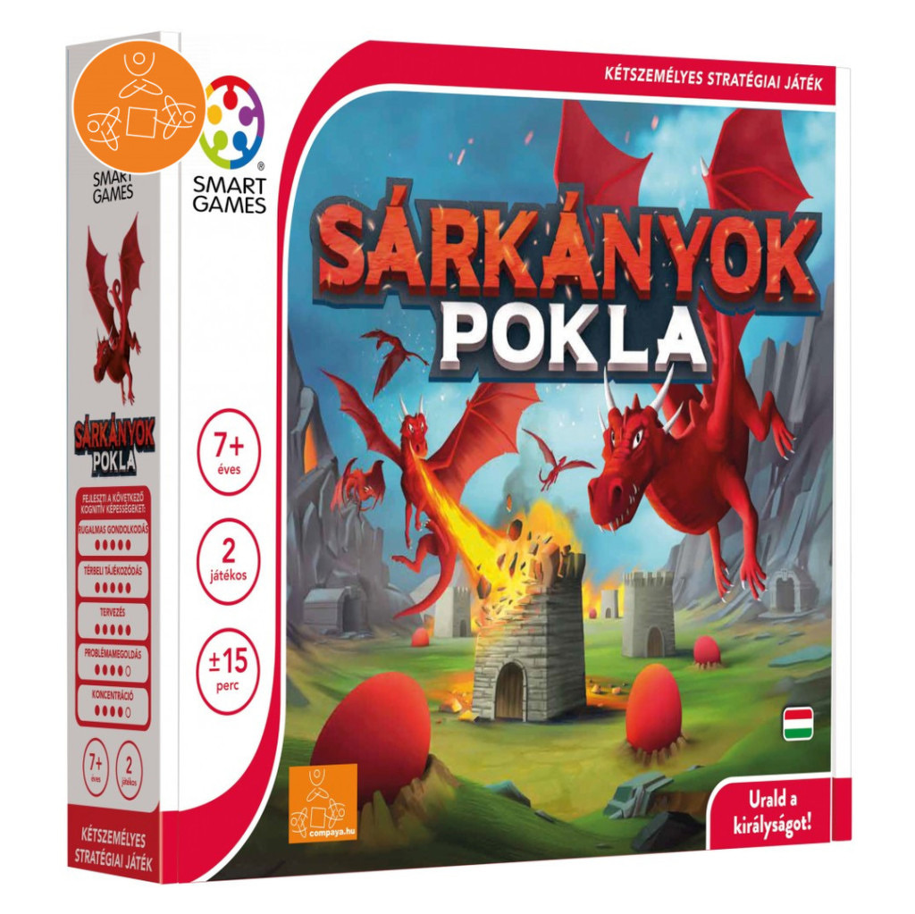 Legyél bátor és építsed fel a saját királyságodat a Sárkányok Völgyében! Sárkányok pokla társasjáték egy izgalmas kétszemélyes stratégiai játék, melyben minden bátorságodra szükség lesz. Készülj fel a csatára, gyűjts sárkánytojásokat, melyeknek a segítségével megidézheted a sárkányokat. A sárkányok segítségével égesd fel ellenfeleid területeit, majd vedd át az uralmat! Ha neked sikerül kiépítened a legnagyobb királyságot, akkor Te kerülsz ki nyertesen a csatából. Csomagolási mérete: 24 x 24 x 9 cm Játékosok száma: 1-2 fő Játékidő: 5-15 perc Ajámlott korosztály: 7 éves kortól ajánljuk