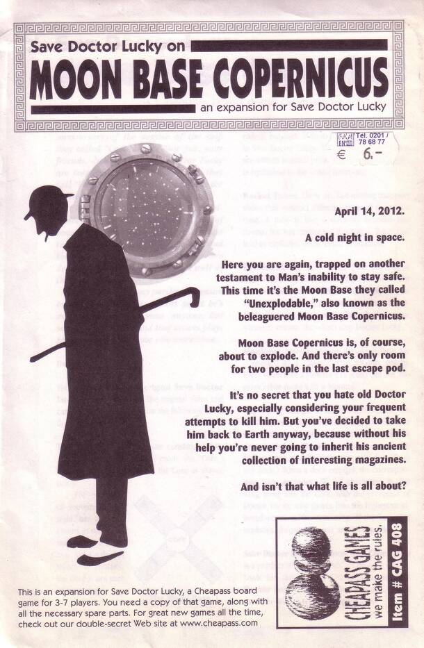 A Save Doctor Lucky on Moon Base Copernicus egy nagyon könnyen tanulható kiegészítő a Save Doctor Lucky társasjátékhoz, 3 - 7 játékos részére, az átlagos játékidő rövidebb, csak 45 perc. A társast, a könnyebb tanulhatósága ellenére, csak 10 éves kortól ajánljuk kipróbálni. A játékmenet erősen épít a szövetségek mechanizmusra.