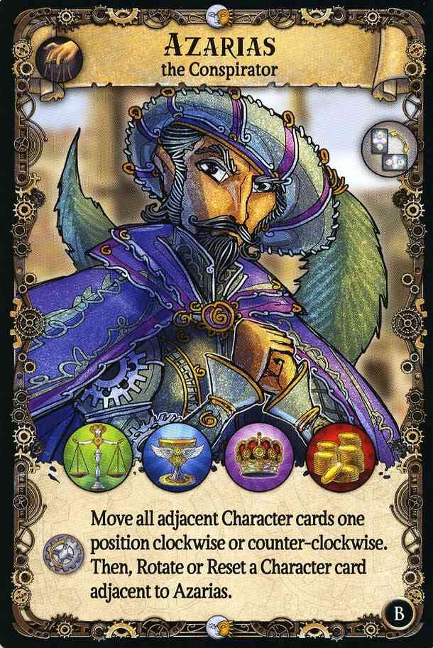 Azarias - The Conspirator "Move all adjacent Character cards one position clockwise or counter-clockwise. Then, Rotate or Reset a Character card adjacent to Azarias." This promo...