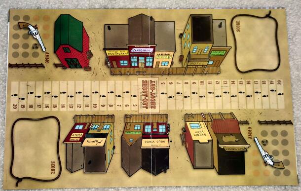The game plays from duel to duel until one player picks up cards with a total value of 14 or more. On each turn, a player may move (closer to his opponent) or shoot (you have 2 guns: a Colt and a Winchester rifle). Optionally, either player may choose to end the duel and retreat (picking up more ammo).