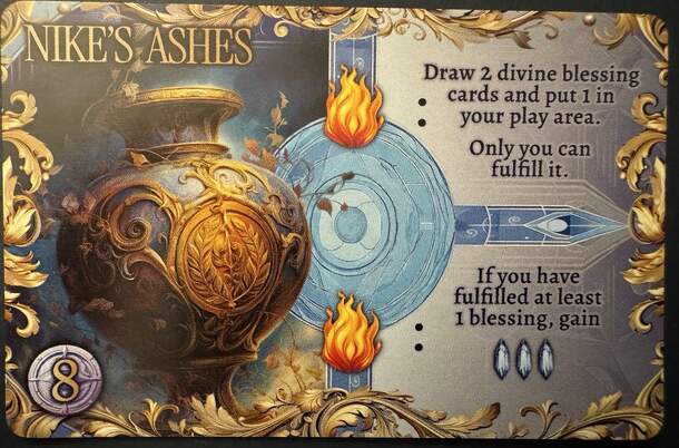A promo card, a trinket "Nike's Ashes" for Sibille. Cost 8. Choose one: - Draw two divine blessing and put one in your play area. Only you can fulfill it. - If you have fulfilled...