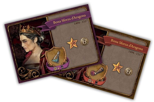 Sigismundus Augustus: Dei gratia rex Poloniae - Bona Sforza d'Aragona is a double-sided promo sheet that represents the ambiguous opinions on Queen Bona circulating among historians. One side shows her as generous and helpful, while the other as treacherous and poisonous; each side has an ability that can be used once per round.