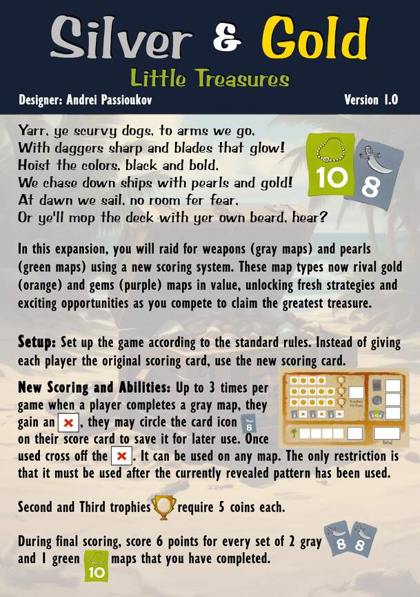 Yarr, ye scurvy dogs, to arms we go, With daggers sharp and blades that glow! Hoist the colors, black and bold, We chase down ships with pearls and gold! At dawn we sail, no room fer fear, Or ye'll mop the deck with yer own beard, hear? In this expansion, you will be raiding for weapons (gray maps) and pearls (green maps) through a new scoring mechanism....