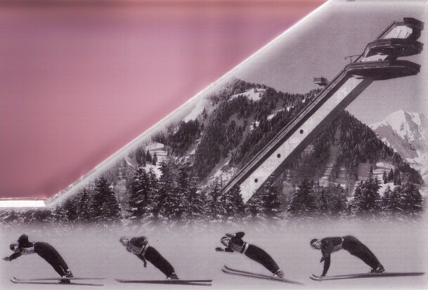 The Ski Sprung Spiel (in English: Skijump Game) is trying to simulate a ski jump competition. After team selection each player will roll dice for selecting the highest position on the jump tower. Therefore all seven dice are rolled. After each roll at least one die has to be set aside face up. When all dice have been allocated the jumper is placed on the tower according to the rolled total result which is equivalent to a certain jump distance in meters. After all players are set up one player puts one of his jumpers for the jump. Then card play takes over. The effect of cards is to add or subtract jumping length from the a fore determined jumping length (the dice roll) or to move the jumper left and right on the hill simulating wind. Other players play cards for this jumper which are countered by the jumping player. This goes in turn i.e. player A plays card jumping player plays card, player B plays card jumping player plays card and so on until each non-jumping player had the chance to play a card. If the jumper is moved too much to the left or right or too long or too short of the board it is counted as a fall. Finally the jumping player plays a card for the landing again adding or subtracting metres. The final result will be noted down. The player which ski jumper has the farthest jump wins the game.