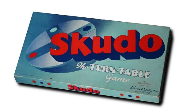 Skudo is a traditional roll and move game that's reminiscent of Parcheesi, Sorry, and Trouble. The main differential elements are 4 on-board discs that allow only the matching color, passage to the paths beyond. By throwing doubles or landing on the "Skudo" space, one can turn a disc thereby continuing their movement or blocking their opponent.