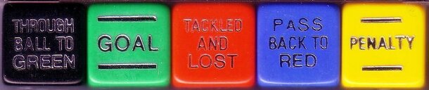 Soccer Dice is a dice game using five different coloured dice with text on each side.