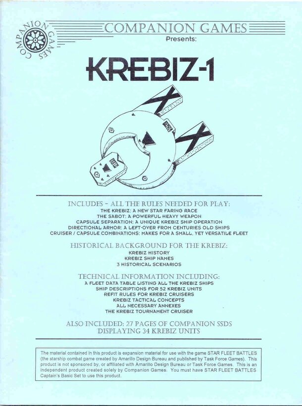 A Krebiz-1 egy összetett kiegészítő a Star Fleet Battles: Captain's Edition Basic Set társasjátékhoz, 2 - 12 játékos részére. A társast, a bonyolultsága miatt, csak 12 éves kortól ajánljuk kipróbálni. A játékmenet erősen épít a hatszög-rács és a kockadobás mechanizmusokra.