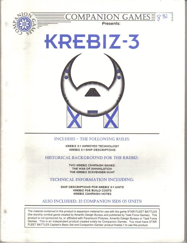 This is the description on the cover: Includes all the rules needed to for play: - Krebiz X-1 improved technology - Krebiz X-1 ship descriptions Historical background for the Krebiz: - Two Krebiz campaign games: - The War of Annihilation, and - The Krebiz Scavenger Hunt Technical information including: - ship descriptions for the Krebiz X-1 units - Krebiz...