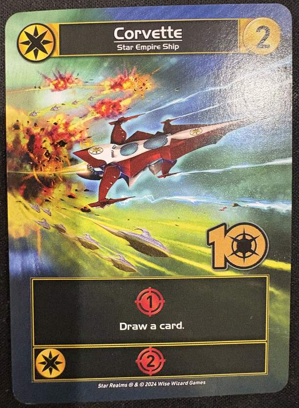 A Star Realms: Corvette Promo Card 10th Anniversary egy könnyen tanulható kiegészítő a Star Realms társasjátékhoz, 1 - 4 játékos részére. Az alapjátékot az Év Játékának jelölték 2014-ben (BGG), illetve ebben az évben több, összesen 3 másik elismerést és jelölést is kapott. A társast, a könnyebb tanulhatósága ellenére, csak 12 éves kortól ajánljuk...