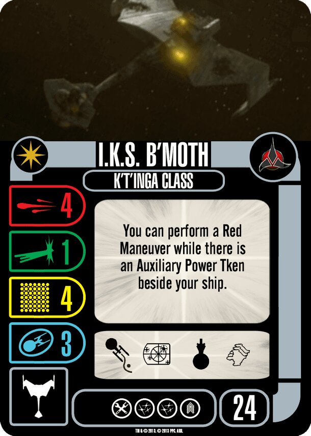 The I.K.S. Negh'Var is the flagship of the Klingon Empire and is commanded by the extremely effective General Martok. It has led several Klingon invasions and has won much honor for the Empire. The Negh'Var is surprisingly maneuverable for its large size. It can also target an enemy ship's shield generators in order to facilitate a massive boarding action...
