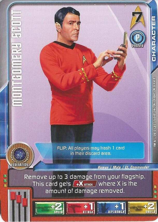 A Star Trek Deck Building Game: Montgomery Scott Promo egy könnyen tanulható kiegészítő a Star Trek Deck Building Game: The Original Series társasjátékhoz, 2 - 4 játékos részére. A társast, a könnyebb tanulhatósága ellenére, csak 13 éves kortól ajánljuk kipróbálni. A játékmenet erősen épít a pakli építés mechanizmusra.
