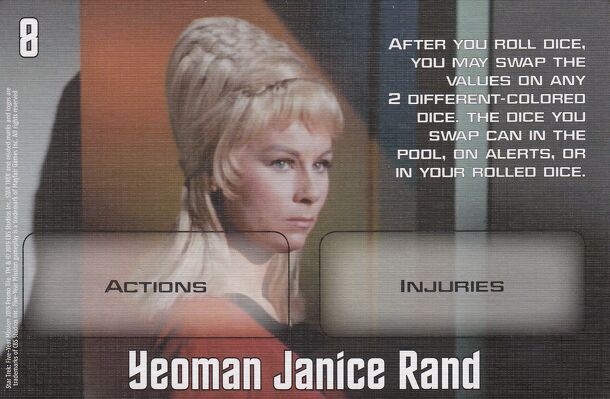 A promo card for Star Trek: Five-Year Mission. The card is labeled #8, and it is two sided like all other character cards, with one side for the Classic series and the other for the Next Generation. The Classic side features Yeoman Janice Rand, who allows you to swap values on any 2 different-colored dice. The Next Generation side shows Acting Ensign...