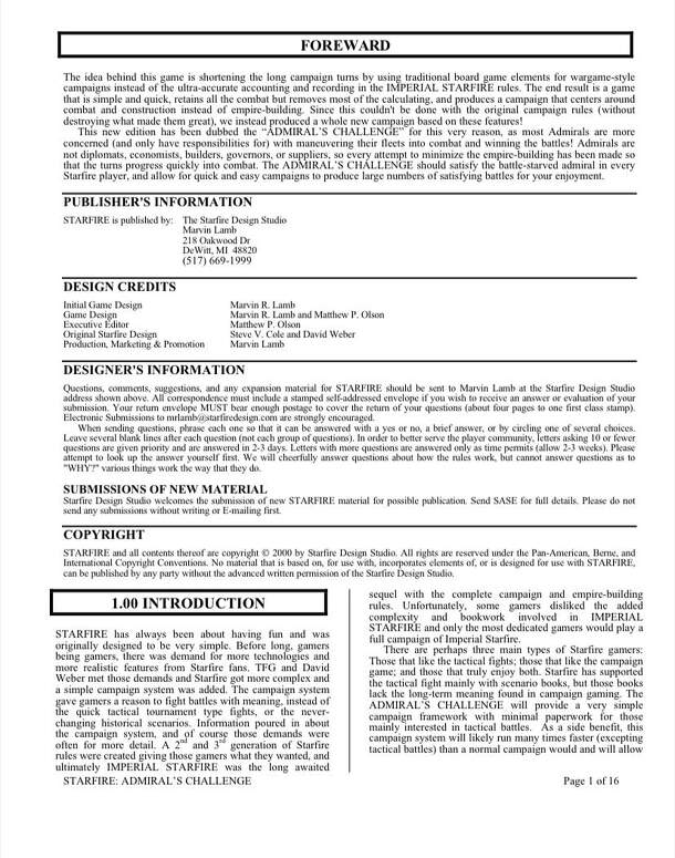 Starfire is a game of battles of between fleets of space warships. Each player commands a fleet of starships, moves their starships, and fires their weapons. Starfire also has campaign rules that allow players to create their own races with which to explore, expand, research, and conquer. Admiral’s Challenge is a simplified (15-20 page) campaign rule set...
