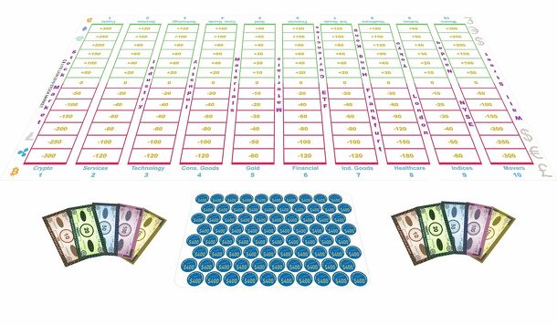 To begin:Roll open Lite Lion Games rollable Stock market gaming mat. Place violet rate detectors to the mid-space, marked “0”. At least two players are recommended to be on the opposite side of eachother/other side of the table to make the finger marks drawing easier. The Players choose own colourfrom the four colours available. Each Player gets 5 pcs tokens of the corresponding colour, each ofnominal value of LL$400 of investment, and LL$2320 cash. The cash money is issued as following: 1 pcsLL$1000, 6 pcs LL$100, 9 pcs LL$50, 9 pcs LL$20 and 9 pcs LL$10. The investment tokens can beexchanged to cash in the Bank as equal to LL$400 each.The beginner can be chosen in any suitable way, as coin draw and etc. In according to the sequence ofturns, each Player has equal amount of turns per game.