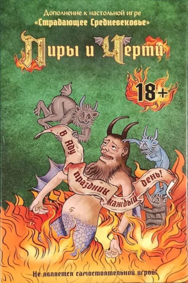 A Пиры и Черти (Feasts and Devils) egy könnyen tanulható kiegészítő a Страдающее средневековье (Medieval Suffering) társasjátékhoz, 3 - 6 játékos részére, az átlagos játékidő rövid, csak 20 - 30 perc. A társast, a könnyebb tanulhatósága ellenére, csak 18 éves kortól ajánljuk kipróbálni. A játékmenet erősen épít a kártya húzás, a vedd el és az események...