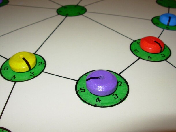 Stronghold is played on a board showing a network of 25 spaces. Each player has 8, 10, or 14 playing pieces, depending on if 2, 3, or 4 people are playing.