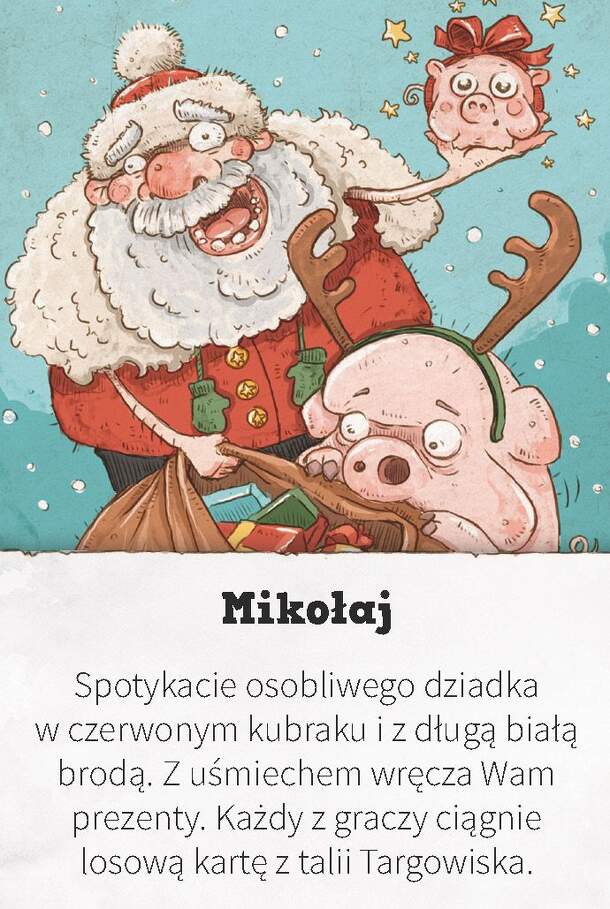 Promo card for the game. Card text: Mikołaj Spotykacie osobliwego dziadka w czerwonym kubraku i z długą białą brodą. Z uśmiechem wręcza Wam prezenty. Każdy z graczy ciągnie...
