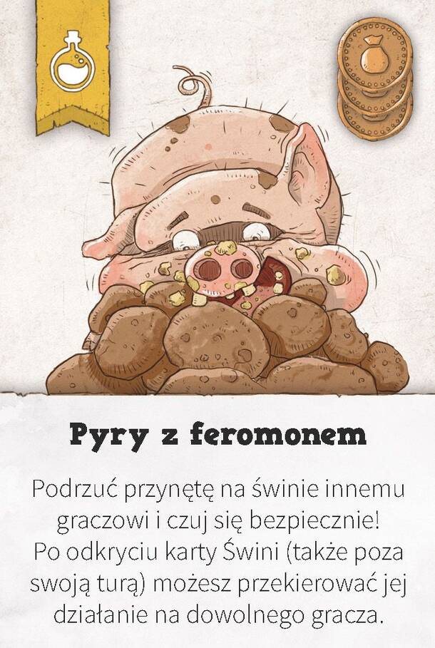 Promo card for the game, issued specifically for Pyrkon 2024 event. Card text: Pyry z feromonem Item Cost: 3 coppers Podrzuć przynętę na świnie innemu graczowi i czuj się...