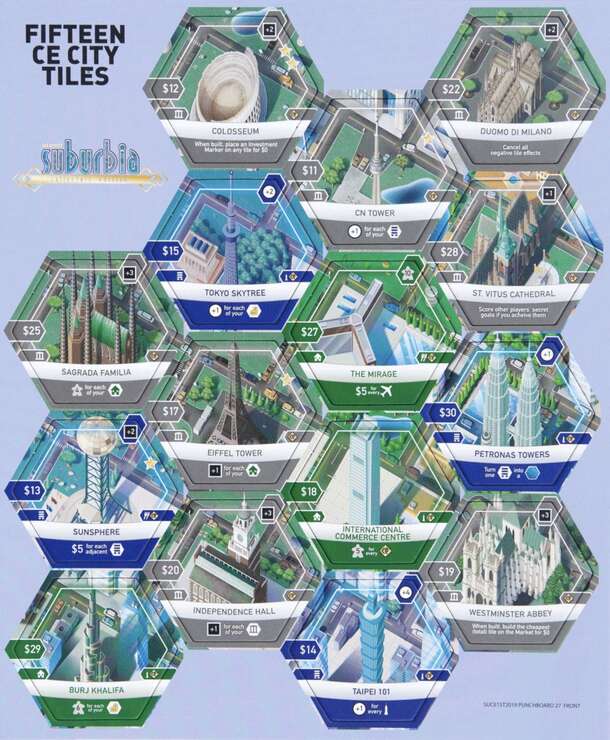 5 City Building Tiles are included in Suburbia: Collector’s Edition (Washington, Chicago, Los Angeles, New York City, and Orlando). 15 additional City Building Tiles were offered as backer exclusives during the original crowdfunding campaign, however, these tiles are now available to purchase through the publisher’s website: • Knoxville (Sunsphere) • Rome...