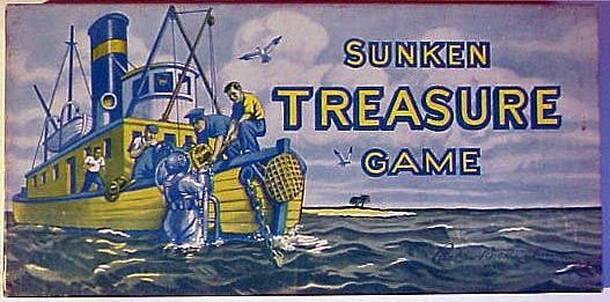 In Sunken Treasure, the player's deep sea diver has to leave the salvage ship to recover a gold bar from a chest at the bottom of the sea. The player must then return the gold bar to the salvage ship. Components include: a board, 5 wooden "gold bars," five wooden play pieces, a card spinner, and a card ship. The rules are printed in box lid