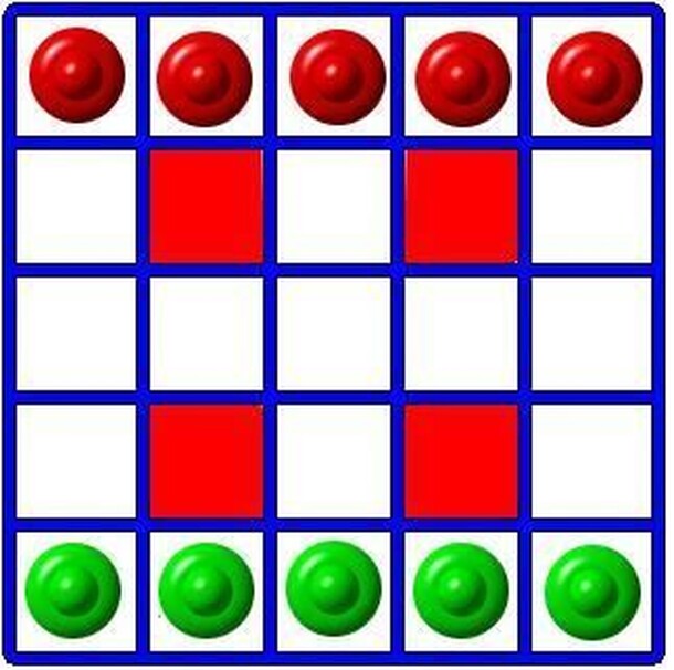 This game is played on a 5x5 board. Game starts with an initial setup position. On each turn, each player must move two friendly stones to adjacent (diagonal or orthogonal) empty...