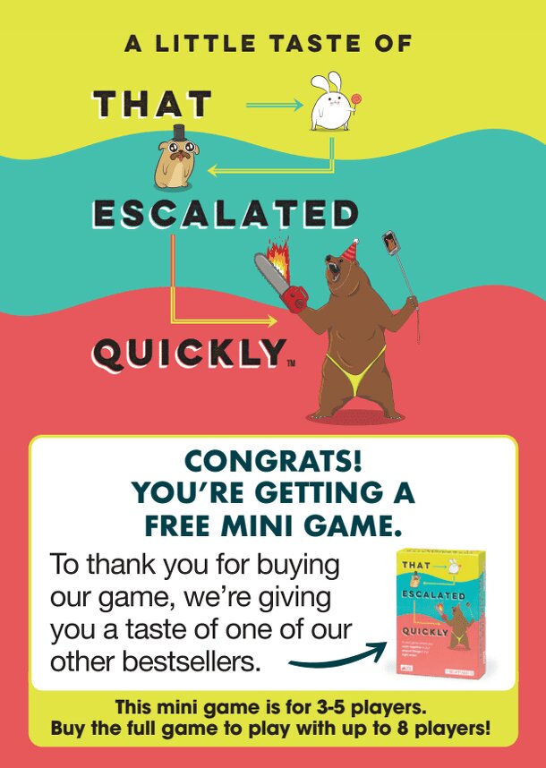 To play That Escalated Quickly, read out a simple question (ex. I’m locked in a tiny room. What else is locked in here with me from cutest to scariest). Then everyone is assigned...