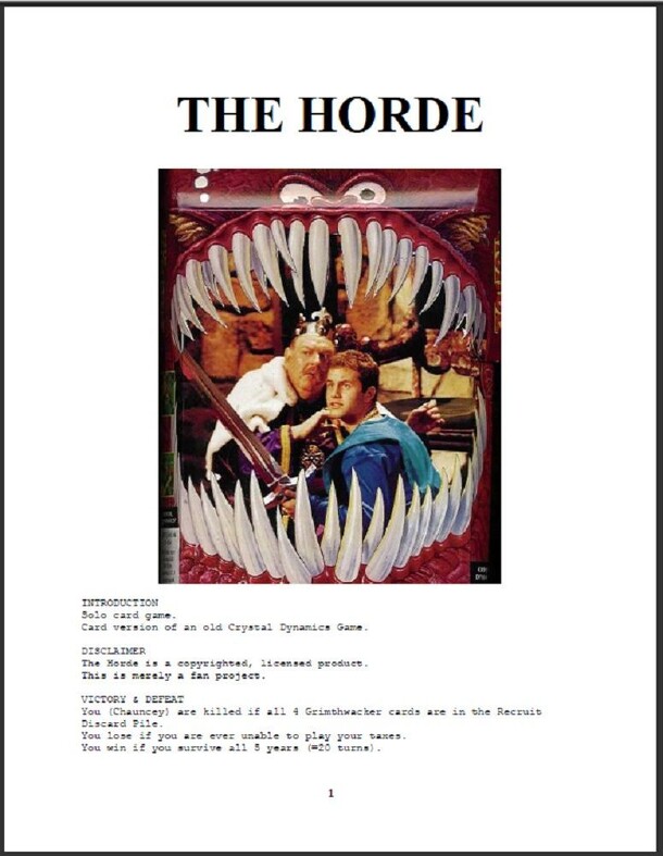 A card game based on the vintage Crystal Dynamics fantasy computer game of the same name. The game is played with two custom decks, a Recruit Deck and a Horde Deck. The Horde Deck is composed of Hordlings, the creatures that make up the Horde. The Recruit Deck includes forces which the player will use to combat the Hordlings.
