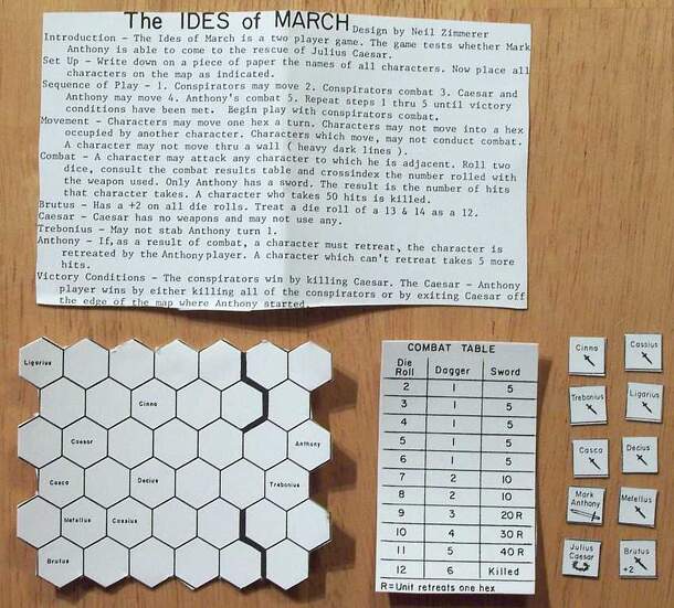 The Ides of March is a small game about the assassination of Julius Caesar. The premise is that Mark Anthony appears on the scene armed with a sword, albeit some distance from the scene. He has to either kill all the conspirators or get Caesar off the map before he is killed. Since he has a sword, he does considerably more damage with his attacks than the conspirators (armed with daggers) can manage.