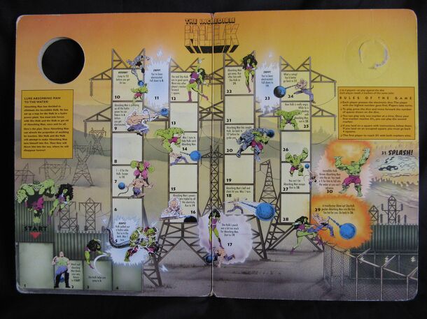 The Incredible Hulk was published as part of the Marvel Comics Super Heroes Game Book, and the board is a double-page spread of the book which is laid flat to play. It is a fairly standard roll-and-move game where players must move two tokens representing Hulk and She-Hulk one at at time along a track by rolling an electronic die. Along the way, some spaces will move players forward or back or cause a loss or gain of a turn. If a player lands on another player's token, he or she moves back four spaces. First player to reach the end with both markers wins.