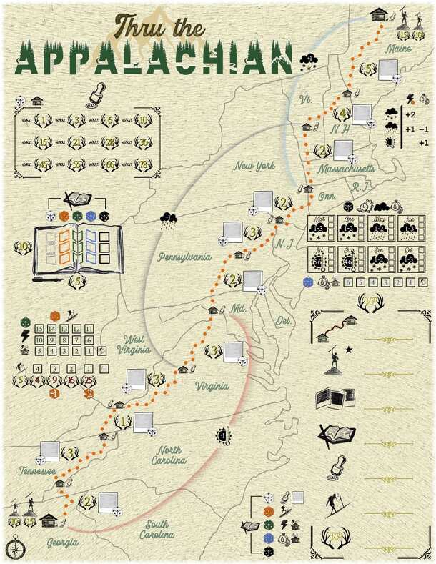 Before embarking on your thru-hike, pack your bag with essential gear to help you handle the most extreme weather, maximize your energy, and your enjoyment points! Don’t forget to stop off and tour the towns, repack your bag, and much more! There are 16 different polyomino-shaped gear, each with a unique shape, size, and ability! With a bagful of goodies...