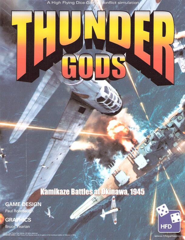 Thunder Gods: Kamikazes at Okinawa portrays the massive Kikusui offensive by waves of hundreds of suicide attacks against the Allied invasion fleet off of Okinawa. The game is composed of three mini-games, one on the US destroyer “picket line”, another on the carrier fleet, and a third on the invasion support fleet, that can be played separately or combined. Players use a standard deck of playing cards to activate their aircraft and ships’ Anti-aircraft batteries as well as resolve combats.