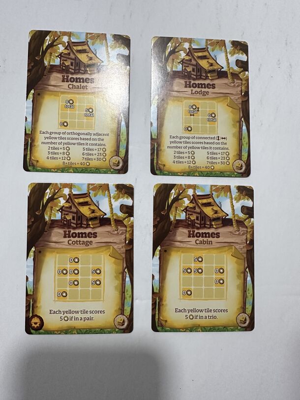 4 Homes Promo cards given out at GenCon 2025. Consists of Lodge, Cabin, Cottage and Chalet. Homes Cottage says: "Each yellow tile scores 5 * if in a pair" Homes Cabin says: "Each yellow tile scores 5* if in a trio" Homes Chalet says: "Each group of orthogonally adjacent yellow tiles scores based on the number of yellow tiles it contains. 2 tiles = 5*, 5...