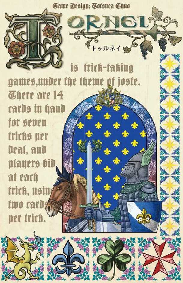 Tornei is trick-taking games, under the theme of joste. There are 14 cards in hand for seven tricks per deal, and players bid at each trick, using two cards per trick. Translated...