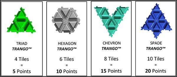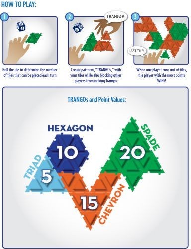 Trango is played with interlocking triangular plastic pieces, which the players place on the table, constructing the board or "matrix" as they go. On a player's turn, he or she rolls a die to determine how many pieces he or she places (1, 2 or 3), and tries to complete geometric figures worth varying numbers of points (or block other players' attempts to do the same).
