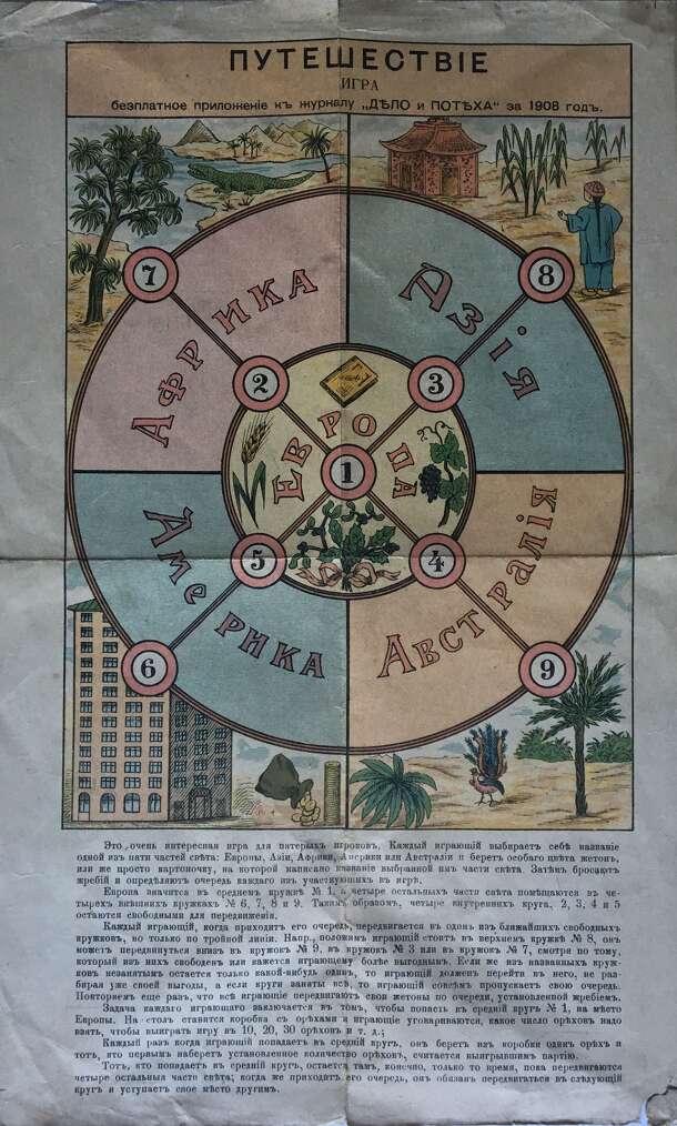 This five-player game was published as a free supplement in the 1908 issue of the Tsarist-era magazine “дело и потеха” (Business and Fun). The game is printed on a single 14.75" x 9" sheet of paper, with attractive color graphics representing the continents of Europe, Africa, America, Asia and Australia. (America is shown as the land of tall buildings and money.)