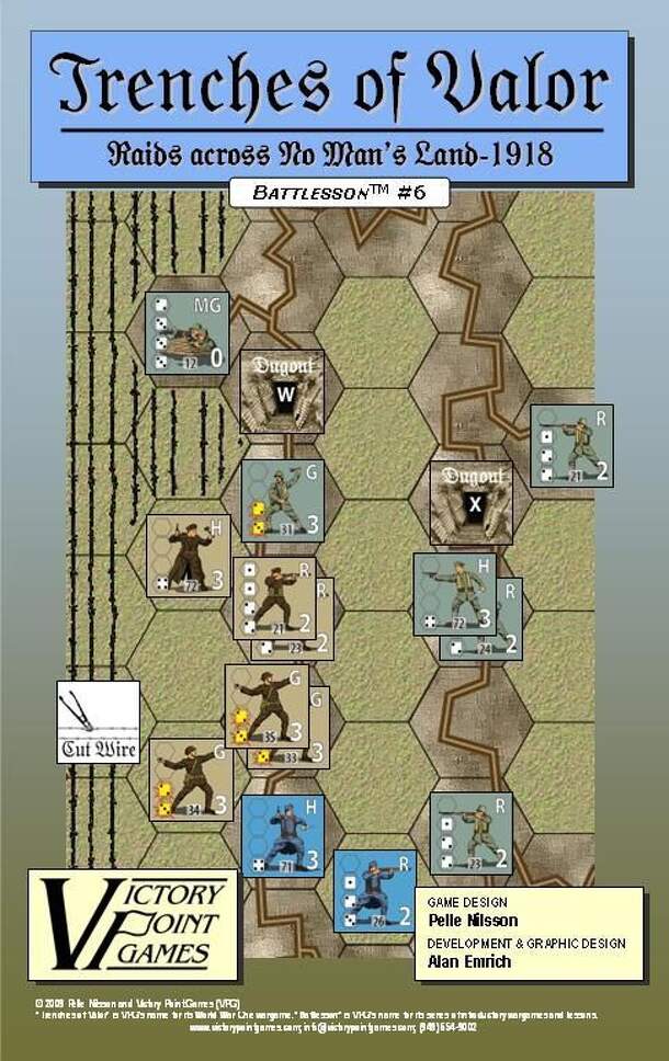 A Trenches of Valor egy nagyon könnyen tanulható társasjáték, 1 - 2 játékos részére, az átlagos játékidő rövid, csak 25 perc. A társast, a könnyebb tanulhatósága ellenére, csak 10 éves kortól ajánljuk kipróbálni. A játékmenet erősen épít a hatszög-rács és a kockadobás mechanizmusokra.