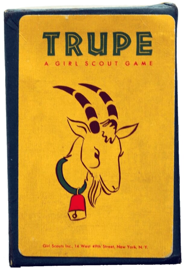 In 1939 Girl Scouts of the United States of America came out with a card game called Trupe. It consisted of 89 cards, and the suits were fashioned after the four levels of Girl Scouting at that time — Brownie, Girl Scout, Senior, and Mariner.