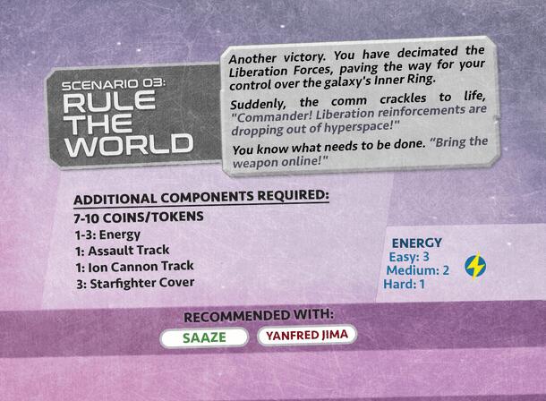 Two cosmic adventurers are in a tricky scenario and must work together. By rolling and manipulating dice for special abilities and combos, you can be the one that guides them to victory. Liberation Forces are decimated, paving the way for control of the galaxy's Inner Ring. “But you promised me a real fight." Suddenly, the comm crackles to life...