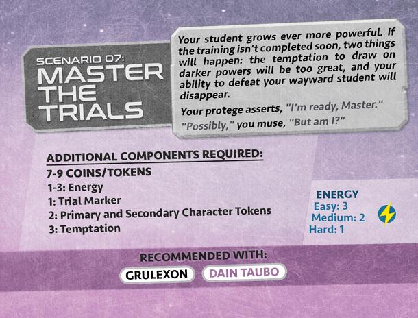 A Twin Stars: Scenario 07 – Master the Trials egy remek társasjáték, 1 játékos részére, az átlagos játékidő rövid, csak 15 - 30 perc. A társast, 8 éves kortól ajánljuk kipróbálni. A játékmenet erősen épít a kollekció gyűjtés, a váltakozó képességek és a merj és nyerj mechanizmusokra.
