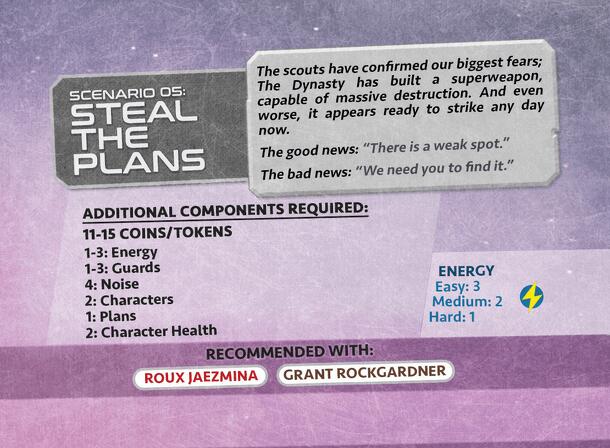 Steal the Plans is a scenario in the Twin Stars solo system by Jason Tagmire and Mike Mullins. The game consists of just 3 cards and players will provide their own dice and coins/tokens. Each scenario comes with 2 all-new characters and can be interchanged with others for a very different gaming experience.