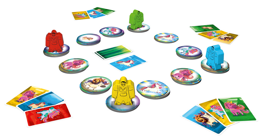 In Das Kleinhorn vom Riesenwald, suitably played color cards let four giants rush through the forest to guard unicorns. There are an amazing number of them: little unicorns, no unicorns, piecemeal unicorns, and of course pig unicorns, slime unicorns and sunshine unicorns.