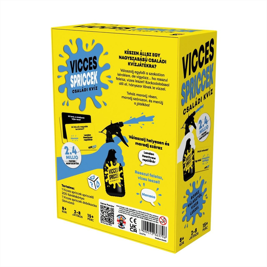 A Vicces Spriccek egy szórakoztató és interaktív társasjáték, amelynek célja, hogy a résztvevők gyorsan és pontosan válaszoljanak kérdésekre, miközben egy vízsugárral szembesülnek, ha hibáznak.