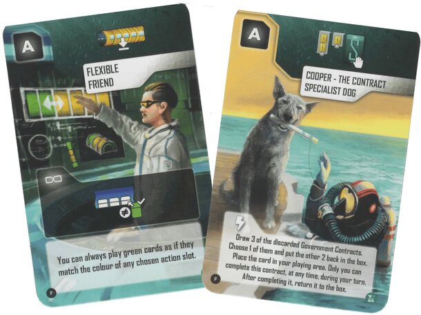 A set of two personal assistant cards, for use with Underwater Cities - New Discoveries: Cooper - the contract specialist dog: Draw 3 of the discarded Government Contracts. Choose 1 of them and put the other 2 back in the box. Place the card in your playing area. Only you can complete that contract, at any time, during your turn. After completing it...