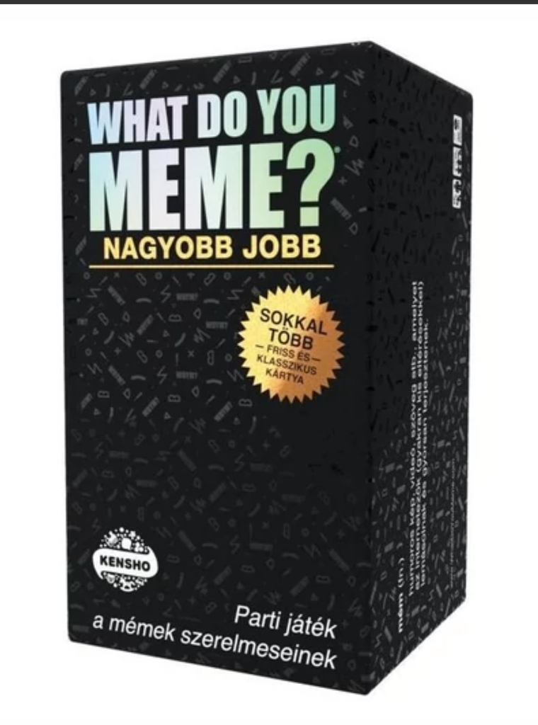 A nagyobb mindig jobb! Megérkezett a What Do You Meme? Nagyobb Jobb kiadása még több mémmel és még több feliratkártyával. Erre tuti neked is van lesz jó mémed! Van itt minden Hide the Pain Heroldtól a Disaster Girl-ig, Már csak az a kérdés, hogy milyen helyzetben használnátok őket. Válasszatok a mémhez egy feliratkártyát a kezetekből, és lássuk, melyik szitu lesz a királyabb! Partijáték 17 éves kortól.